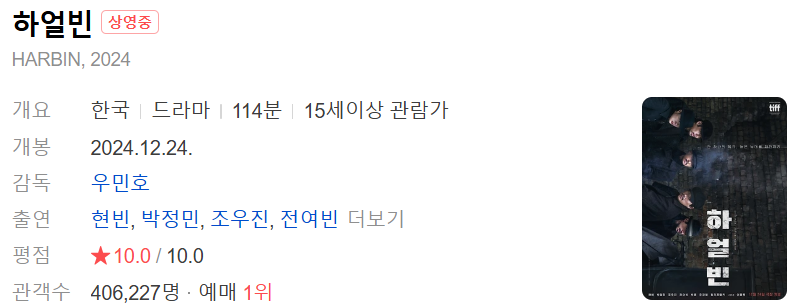 이번 크리스마스 이브에 개봉한 영화 '하얼빈'은 개봉 이틀 만에 백만 관객을 이루고 있습니다.