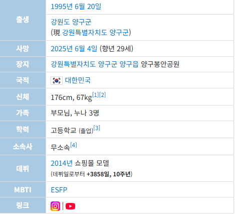 - **모델 김종석(1995년생)**이 6월 4일 사망, 6일 발인이 경기도 하남시 마루공원 장례식장에서 엄수됨. 장지는 춘천안식원·양구봉안공원.