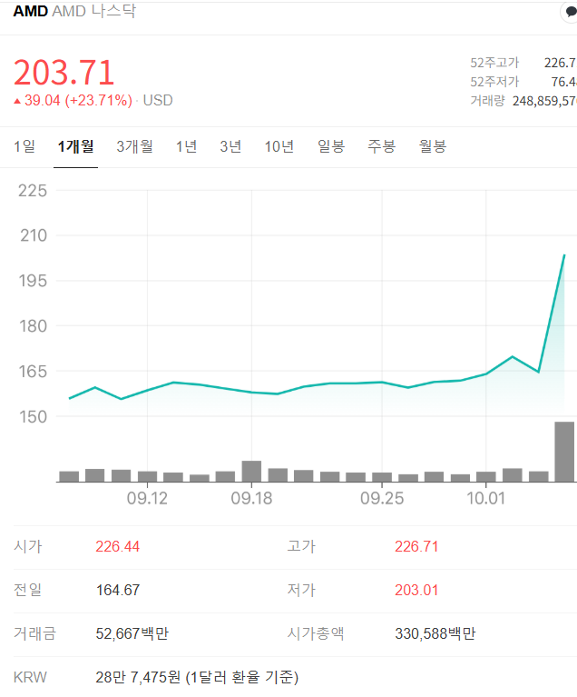 이는 엔비디아가 아닌 AMD의 AI 칩(MI 시리즈)이 AI 산업의 선두 주자인 오픈AI의 인프라에 활용된다는 강력한 신호탄이었습니다. 이 소식 하나만으로도 AMD의 AI 시장 경쟁력과 미래 성장 가능성에 대한 시장의 기대감이 폭발적으로 증가했습니다.