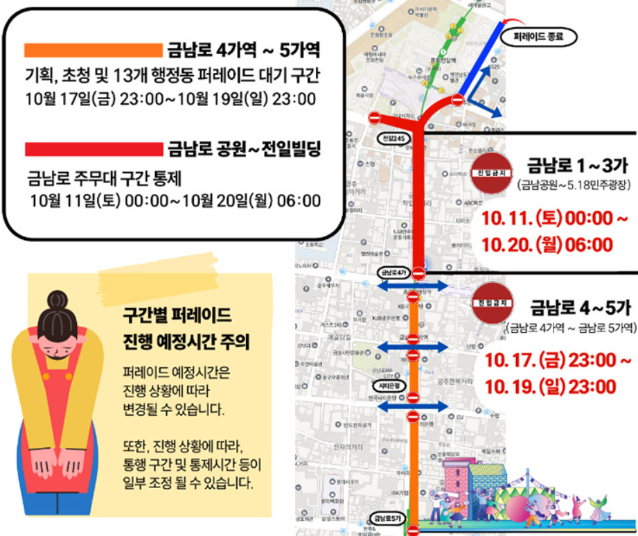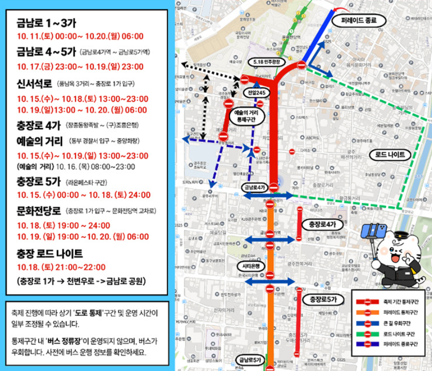 - 금남로 교통 통제: 보통 축제 기간 전후로 며칠간 금남로 4가에서 5·18민주광장까지 차량 통행이 통제됩니다. 특히 퍼레이드가 진행되는 주말에는 통제 구역이 확대되고 시간도 길어지므로, 자가용 이용은 최대한 피하는 것이 좋습니다.